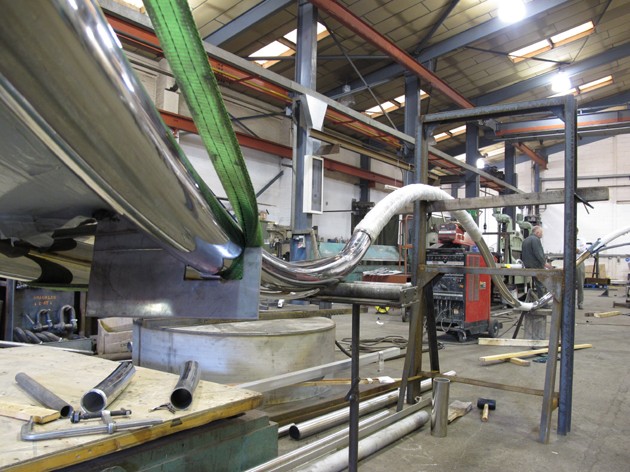 The concept has been developed in close collaboration with architect Richard MacCormac and landscape designer Christine Facer. The geometry of the sculpture has been devised to harmonise with the topography of the garden, providing an interplay with the grassed areas. At one point the form divides, branching off into a sigmoid curve. The serpentine, mirror polished forms reflect the imagery of grass, sky and surrounding trees.